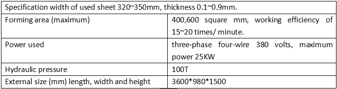 नर्सरी ट्रे सीडिंग मेकिंग मशीन तकनीकी पैरामीटर प्रयुक्त शीट की विशिष्टता चौड़ाई: 300~320 मिमी, मोटाई: 0.8~2 मिमी। निर्माण क्षेत्र (अधिकतम): 400*600 मिमी, कार्य कुशलता 15~20 बार/मिनट। प्रयुक्त बिजली: तीन-चरण चार-तार 380 वोल्ट, अधिकतम बिजली 25KW हाइड्रोलिक दबाव: 100T बाहरी आकार (मिमी) लंबाई, चौड़ाई और ऊंचाई) 3600 मिमी * 980 मिमी * 1500 मिमी